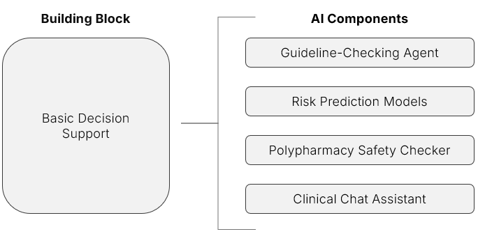Your AI solution stack: a guideline-checking agent that knows context matters. Risk prediction models that forecast, not just flag. A polypharmacy safety checker that understands drug interactions dynamically. A clinical chat assistant that lets clinicians ask questions in plain English.