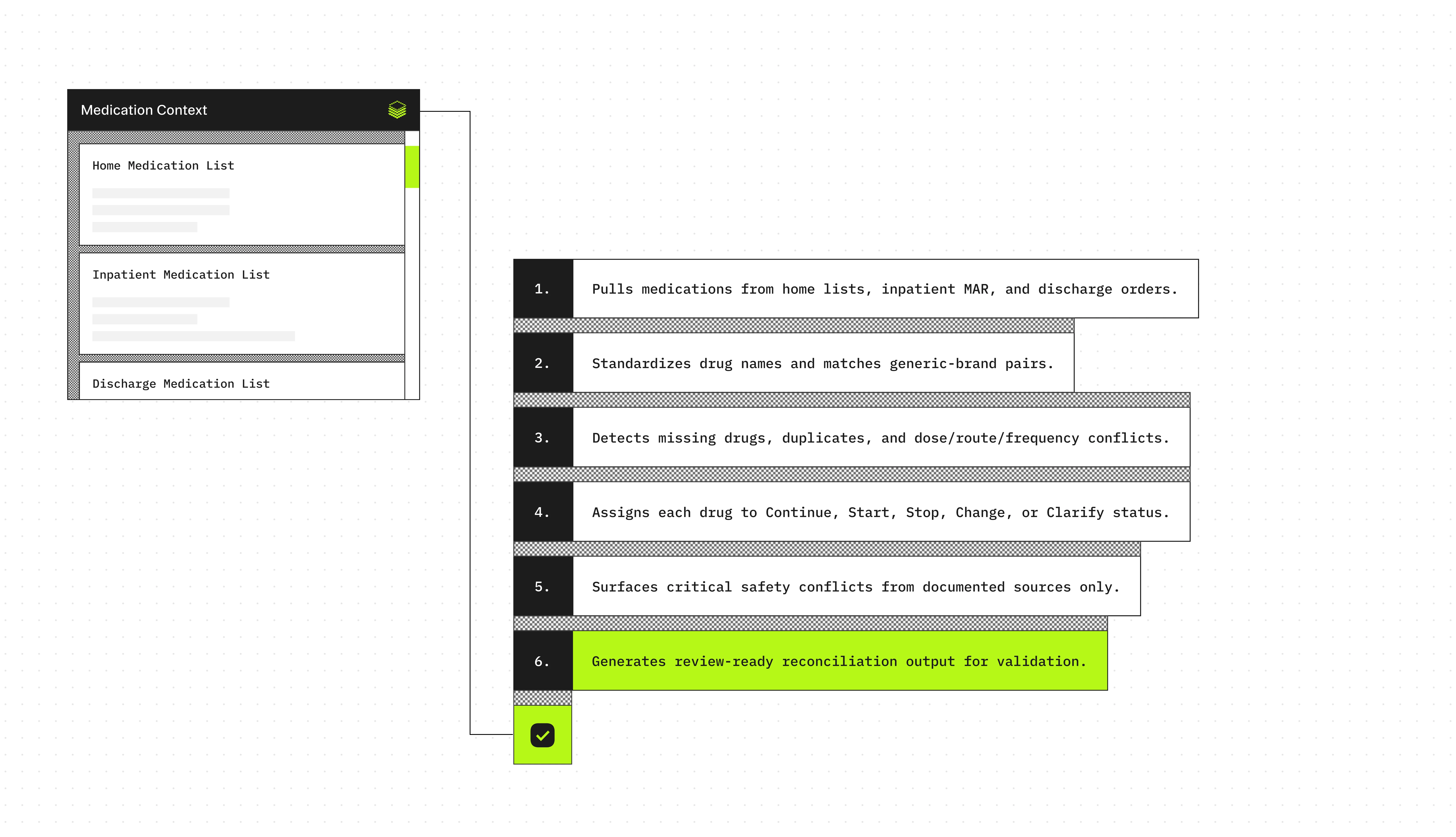 The Medication Reconciliation Agent helps clinical teams produce an accurate, review-ready medication list by comparing a patient’s home medications against inpatient administration records and discharge prescriptions.