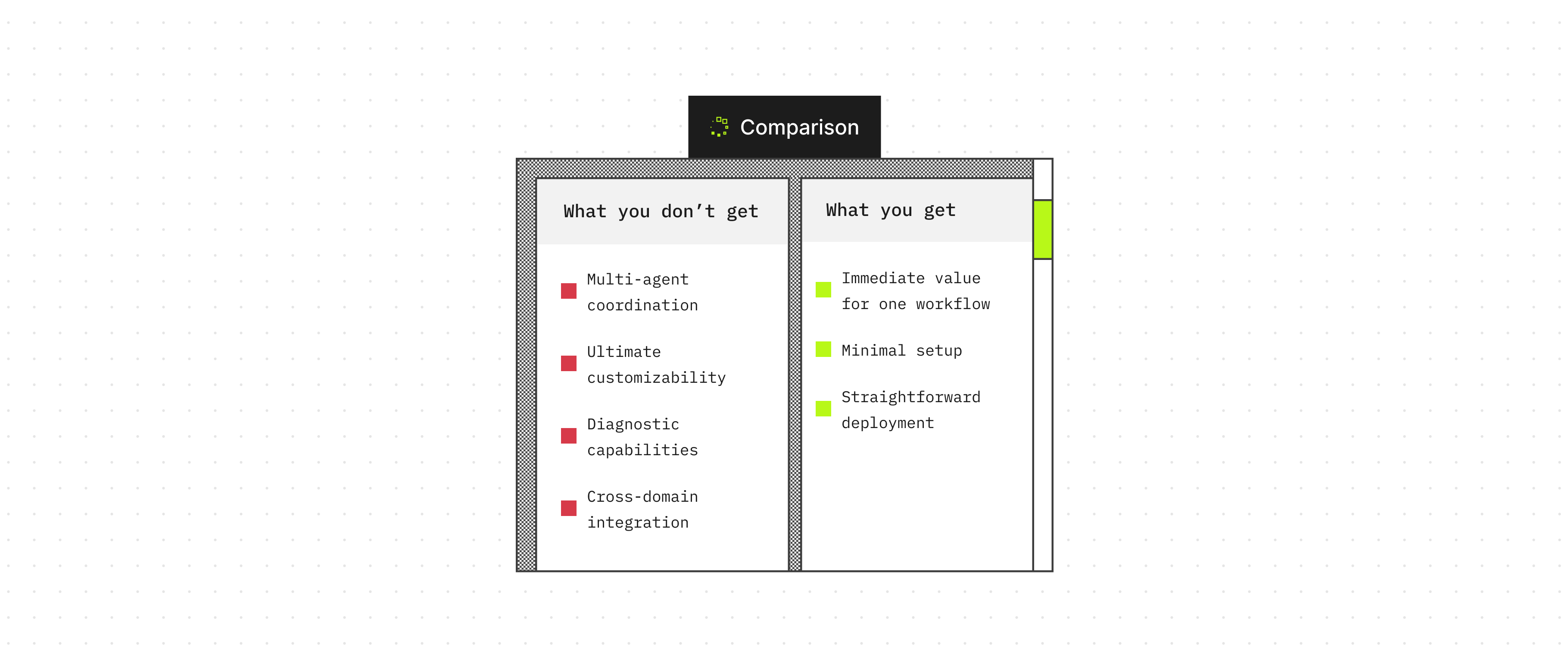 Prebuilt agents solve a specific problem out of the box. A coding agent. A documentation agent. A triage agent. You get something working quickly with minimal engineering effort. For narrow, well-defined use cases, this approach coule make sense. Fast deployment of a packaged product, minimal setup, immediate value.
