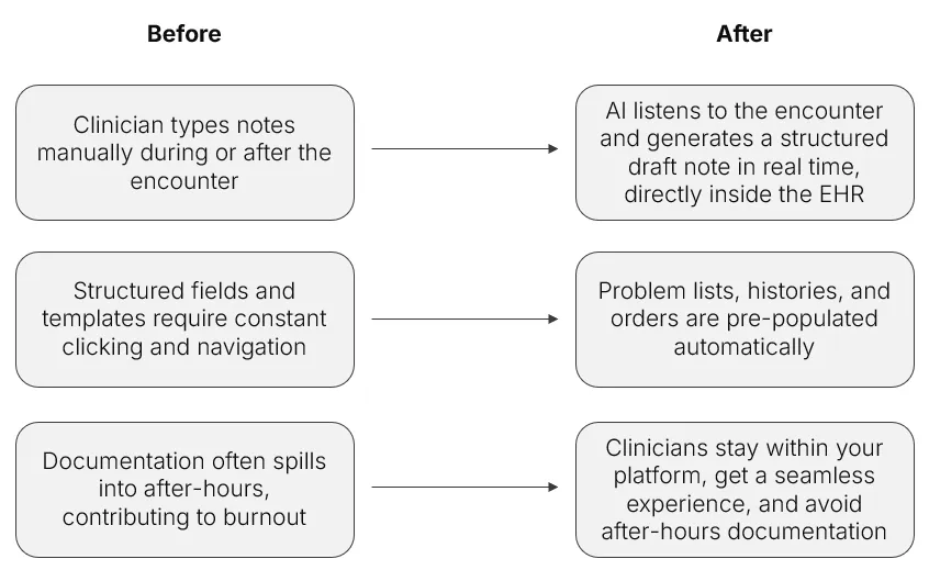 Integrating an ambient scribe is a quick win for your customers. It reduces the burden of documentation while capturing the rich clinical dialogue that fuels downstream AI augmentation and automation—becoming a critical input for the rest of your AI roadmap.