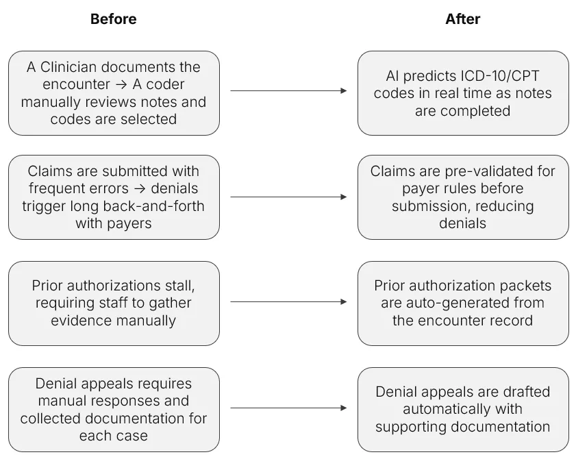 What success looks like: as Dr. Williams completes her note, the AI has already identified the correct ICD-10 and CPT codes, checked them against payer rules, flagged potential prior authorization requirements, and prepared the authorization packet with supporting clinical documentation. Coding accuracy jumps to 98%, prior authorization approval rates hit 91%, and days in AR drop by 30%.