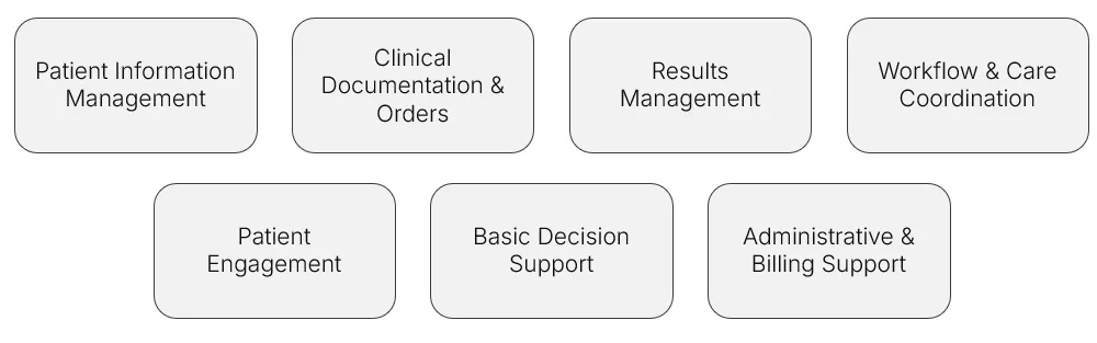 Every EHR, regardless of vendor or setting, must deliver on a set of foundational capabilities. These represent the minimum viable functions that enable providers to document, coordinate, and bill for care. Without them, an EHR cannot serve as the central nervous system of a health system or practice.