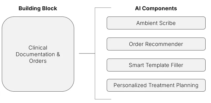 Going forward, every EHR, regardless of vendor or setting, must deliver on a set of AI capabilities. We see each of the basic building blocks of an EHR as an opportunity and entry point to ship differentiated, high-value AI features. Treating these building blocks as launchpads for AI allows you to move fast without starting from scratch. Instead of reinventing the entire product, you can layer intelligence into what already exists, solving problems that matter most to your users, staying competitive in a crowded market, and proving value quickly.
