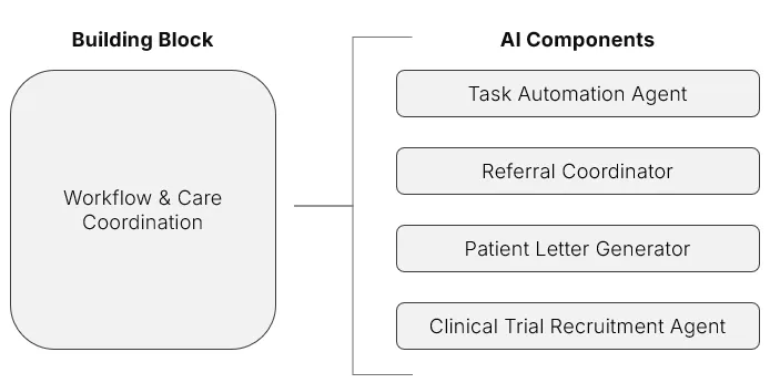 Your AI solution stack: a task automation agent that handles routine follow-ups. A referral coordinator that generates letters and tracks responses. A patient letter generator that writes in plain English. A clinical trial recruitment agent that identifies eligible patients automatically.