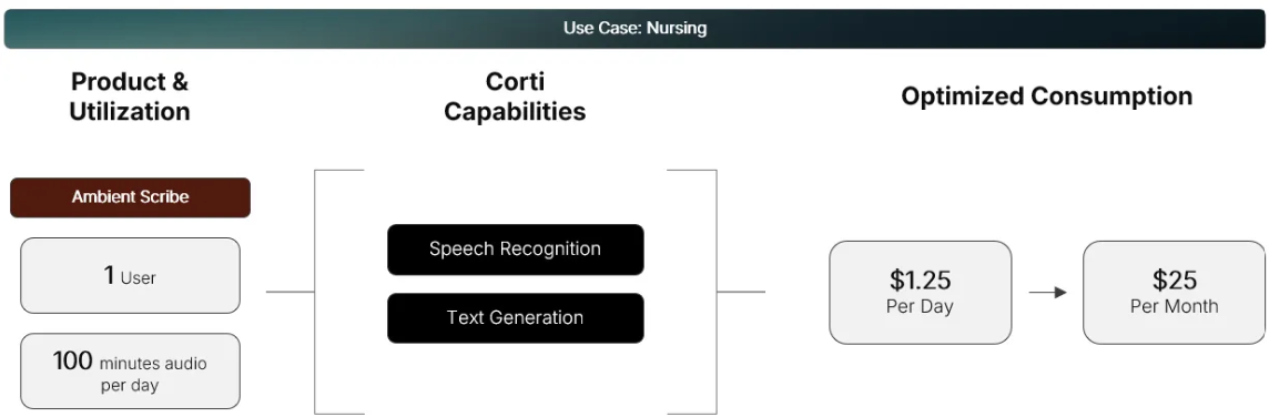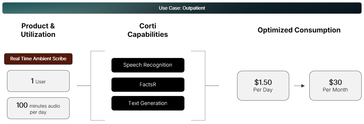 Here are three real-world examples of how developers are using Corti to power production-ready ambient scribes, along with illustrative cost models showing how optimized consumption keeps performance high and spend predictable.