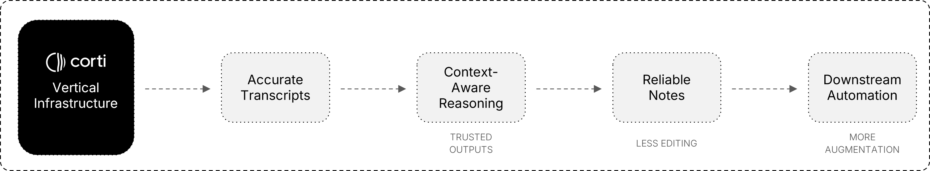 At Corti, through our work with thousands of developers building voice-assisted AI applications for healthcare, we know what happens when these foundations are weak. Builders come to us with applications built on generalist infrastructure, stitched together with brittle prompt stacks, creating engineering headaches and end-user frustration when outputs stray from the truth of the clinical visit. When applications with those foundations go into production, clinicians lose trust, developers spend cycles patching hallucinations, and ultimately, health systems see adoption stall because the tools can't scale beyond narrow use cases or reliably support downstream workflows that drive real RPI gains.