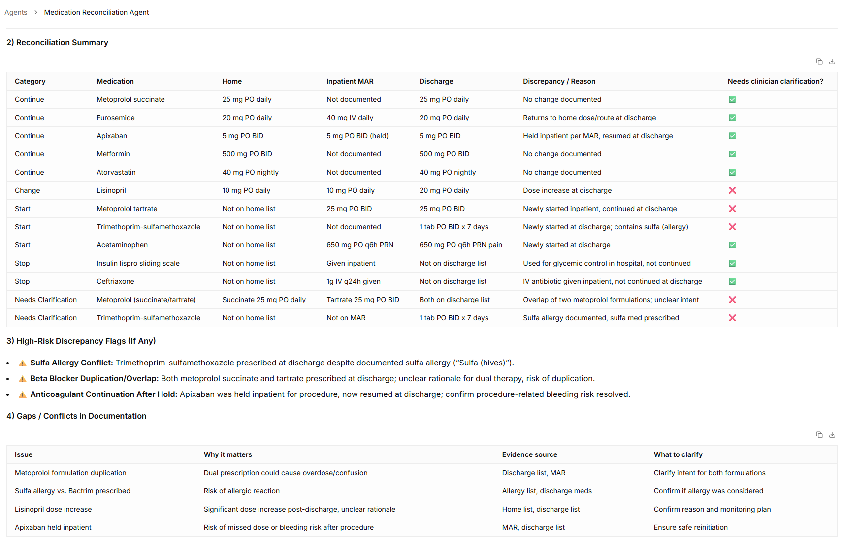 Check out the Medication Reconciliation pre-configured agent in action, working through complex cases.