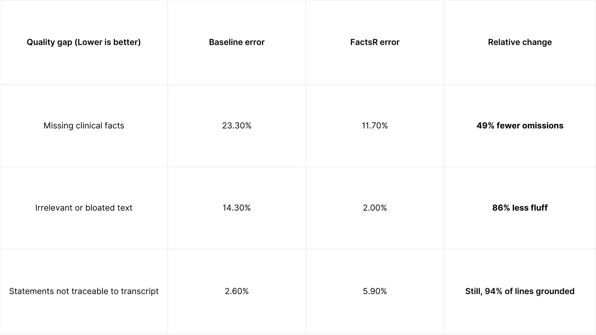 - Less cognitive overhead: Early user tests found doctors removed six irrelevant facts and added four missing ones per visit, all without rewinding the entire transcript.